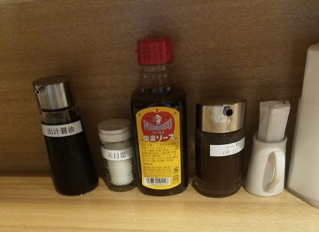 卓上に辛口ソース、中濃ソース、天日塩、出汁醤油がある。