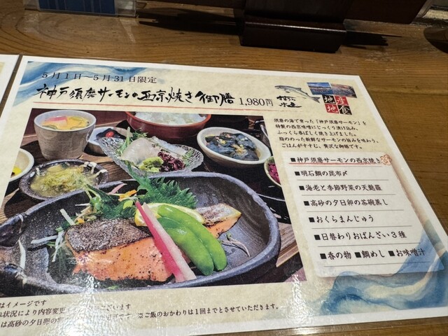 サーモン西京焼き御膳の方は、ご飯が白ごはんか鯛めしから選べます。ボリューム満点ですが、ご飯のおかわりができるので、男性にもおすすめのお店。また神戸付近に行くことがあれば、お伺いしたいです☺️