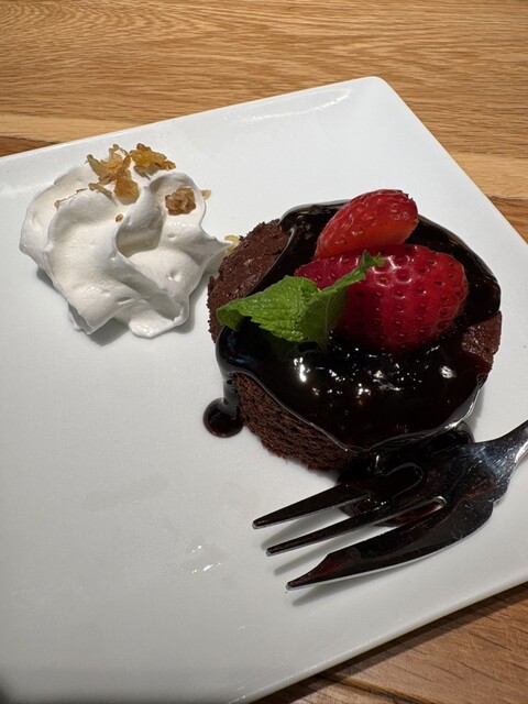 ガトーショコラは濃厚で、横のクリームは甘くなくてさっぱりしていて、ショコラの上にのせてもおいしいです。