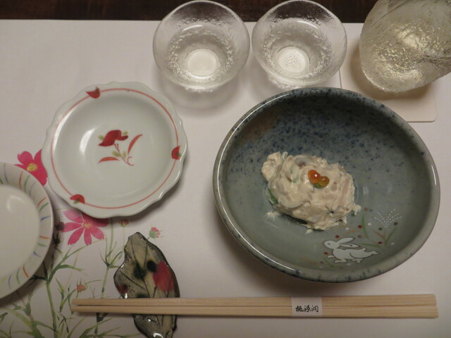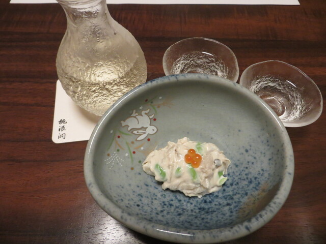 長崎の地酒「六十余州」をお冷でオーダー、突き出しは白和え。