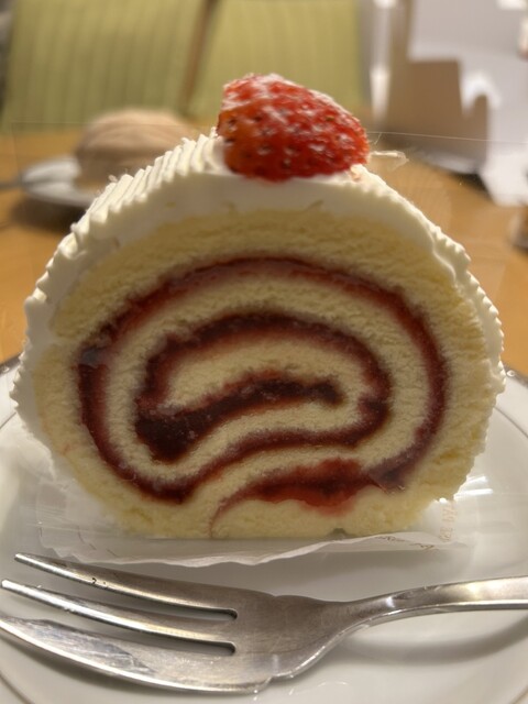 苺のロールケーキのロールの中は苺のジャム?が入っていて甘味と酸味のバランスがよく、よくある生クリームと刻んだ生の苺が入ったロールケーキとは違う味わいです。