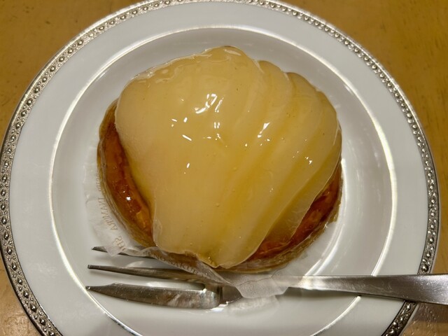 タルトポワールはサクサクの生地の上にバニラビーンズたっぷりのカスタードクリーム、その上に上品な洋梨のコンポートがのっていて、三位一体の美味しさです。特にカスタードクリームは滑らかでプロの技!うっとりします。