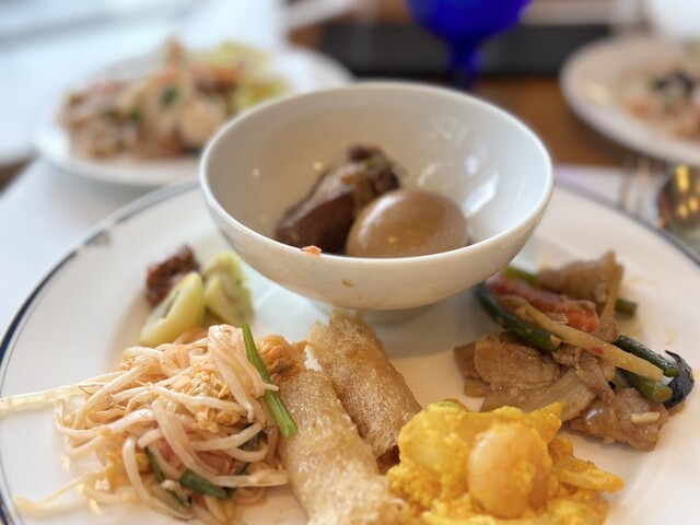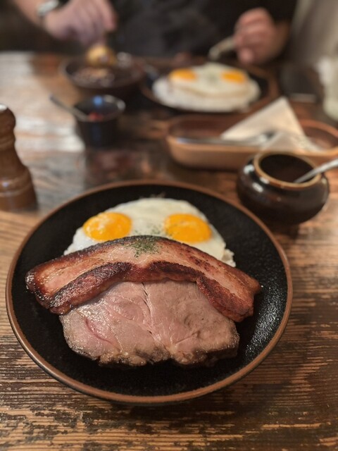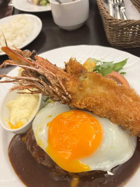 迷って決めた洋食プレートにはエビフライとハンバーグがついてその上にトロッと半熟目玉焼きが...