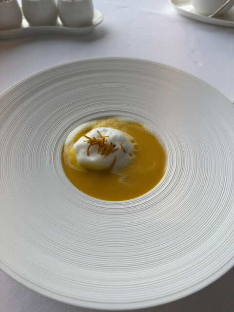 体があたたまる温度でお味も上品、とにかく美味しい。濃厚なかぼちゃスープにムースのようなものが合わさっていて、舌触りや口に入れた時の感覚が楽しい。おかわりしたかったです︎絶品^_^
