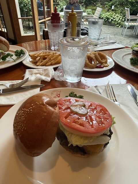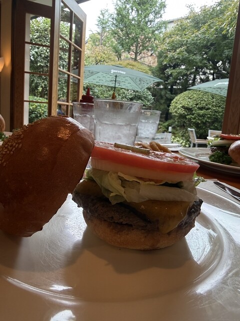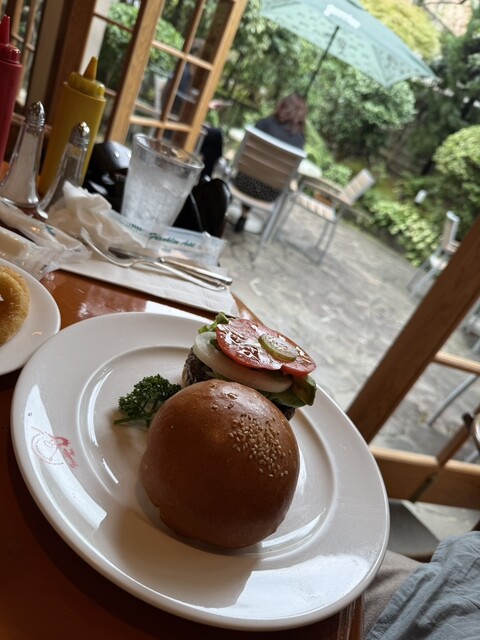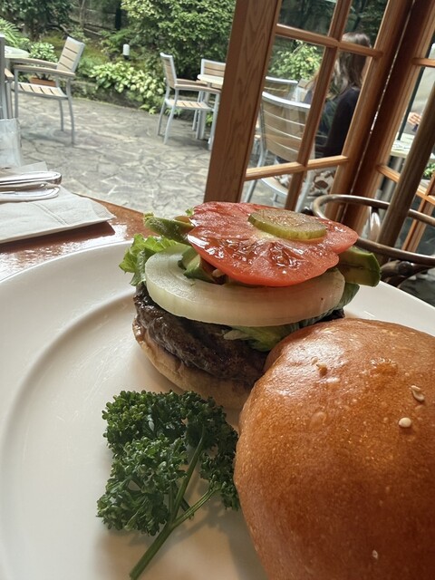 感動的なジューシー肉に新鮮野菜のハンバーガーを素敵なガーデンを眺めながらいただきました