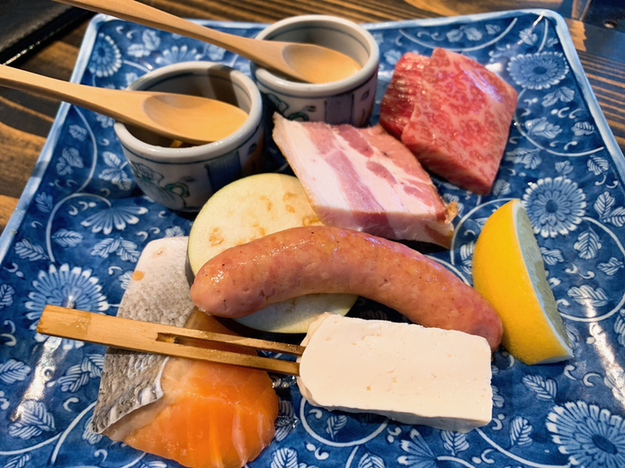 メインは囲炉裏で炙る和牛2種。満腹過ぎて激しく後悔していると、お肉はお代わりできますよ、と言われ、目がテンになりました。マジですか…という表情が顔にでていたか、お肉は食べきれなかったら翌日の朝食にまわしますよ、と仰っていただけました(笑)。素晴らしいサービスにまた感激。