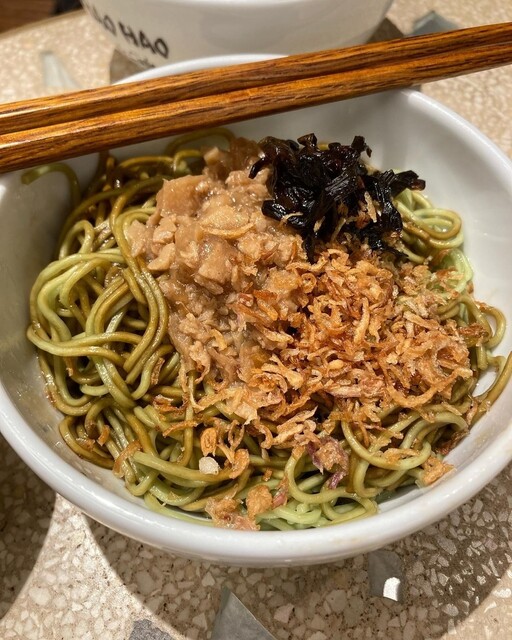 甘辛い油そば!カレー味のスープ付きでした。よく混ぜて食べるのがおすすめ。