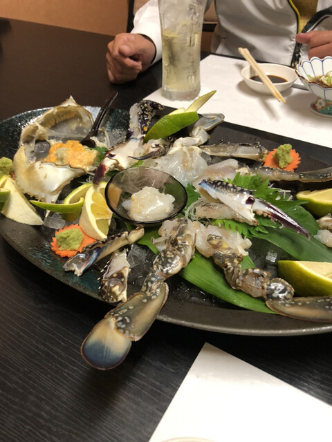 渡り蟹の刺身を初めて食べ、牡蠣の天ぷら、あじの刺身など、A級グルメのオンパレード。最高でした。