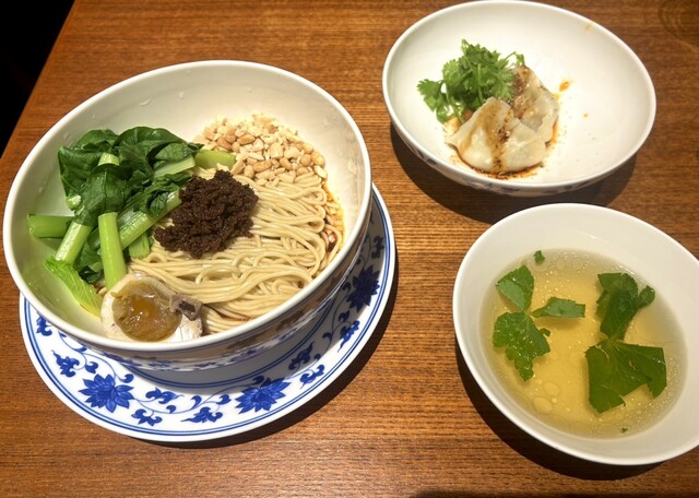 担々麺は麺の底にタレが溜まっていて、かき混ぜて食べる感じでした。砕かれたナッツ(松の実とかピーナッツ?)の食感、小松菜のシャキシャキ感、半熟たまごがとても美味しいです。