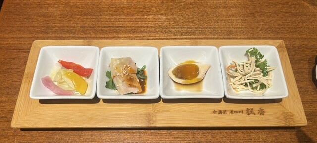 前菜4種、担々麺、スープ、別で頼んだサイドメニューの水餃子、の順にテーブルに届きました。