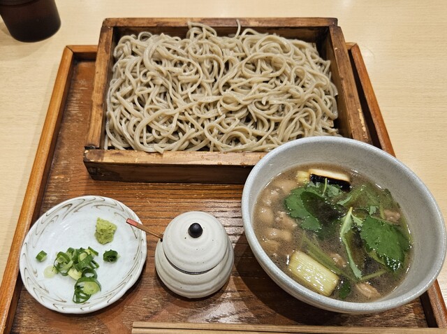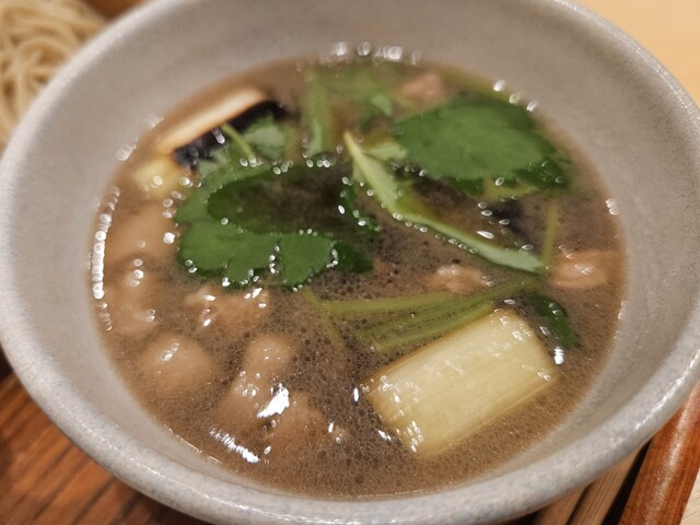 この鴨汁に蕎麦をつけて頂きます。鴨の旨味と蕎麦の香りが最高のコンビネーション!冷たい蕎麦と温かい鴨汁の対比も美味しさを引き立てています。薬味としてネギとワサビが添えられていますが、お好みで加えるとこちらも良いアクセントに。