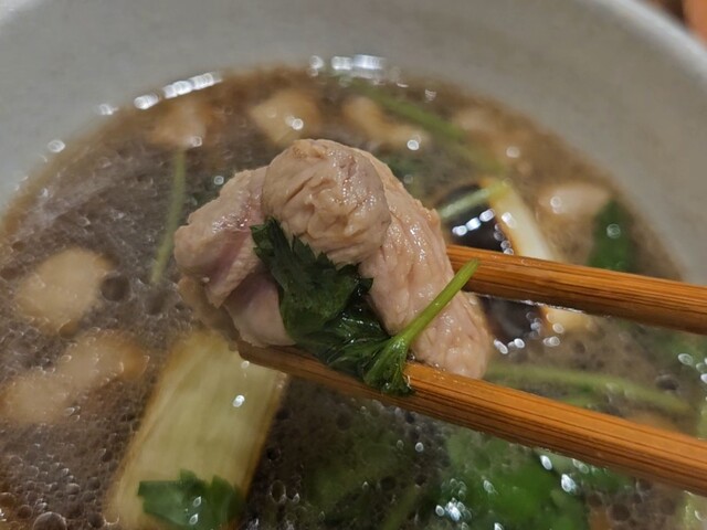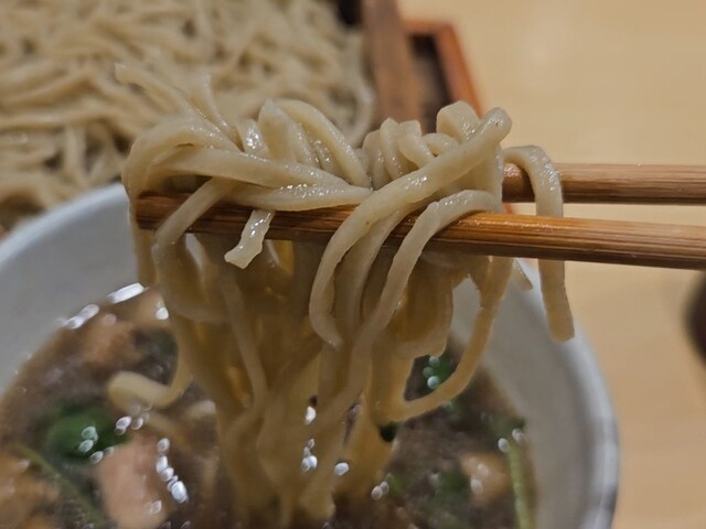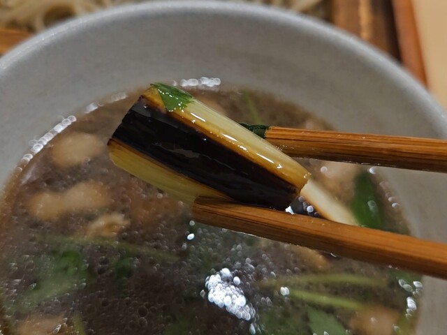 鴨汁は濃厚な鴨の出汁が効いています。具材は鴨肉やネギ。やはり昔から鴨にはネギなんでしょうね。ネギは焼いてから入れてあるので甘味が増しています。
