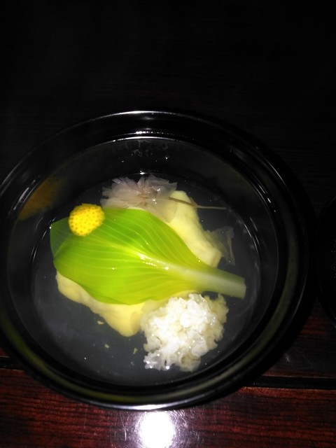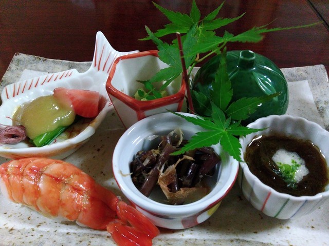 の茶わん蒸し。お凌ぎは蛍烏賊の酢え、季節の山菜、海老の寿司、木の実和え、モズク・・・お椀には梅の花を散らした揚げ出しにトロロが胃に優しい。向付は旬の刺身で鯛、烏賊、鮪、甘エビで焼酎も進む。山海の素材を使った八寸から日本酒にかわる。焼き物は鰻の白焼きが上品で美味しい。鮎の天ぷらの後は毛蟹が珍味だ。