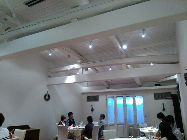 町家を再利用したキュレ·ド·ミューでフレンチを頂きました。2階は新たに梁を設けて一つの部屋に改修し。室内は白に統一して清潔。