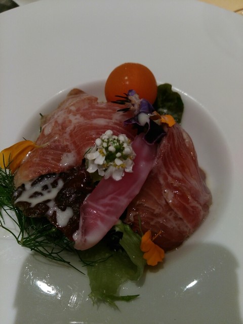 27種類ものハーブの上につぬ鰤と豆乳のドレッシングのサラダ