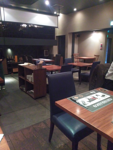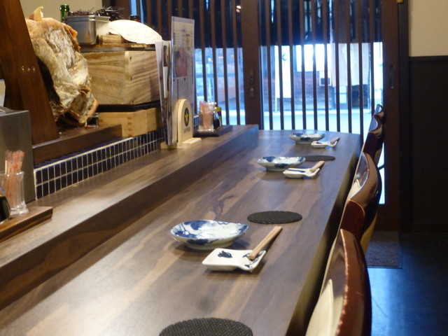外観とは裏腹に内部は古さの中に、電気配線や照明器具には今風のモダンな意匠だ。店内は1階のみで、長いカウンターやテーブル席4つが配置されていました。格子戸から差し込む光が柔らかである。