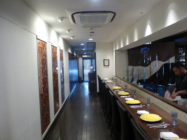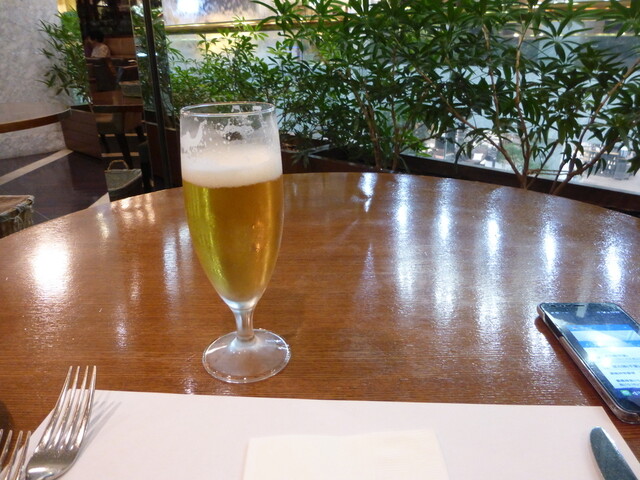 その店は開放的で明るい清潔なお店でした。案内されたのは滝の見える席で、レストラン街の中心に涼しげな水の流れを配置。注文したビールを飲み干す、うまい!千葉の最終はコース料理を注文。