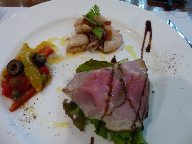前菜はハム、背ヤリイカ、パプリカの3種盛り。ヤリイカは身が柔らく海の香りが鼻孔を擽る。そう言や、千葉県は半島県で全周を海に囲まれている、農業県であり海産物が豊富だ。温かいパンも出される。