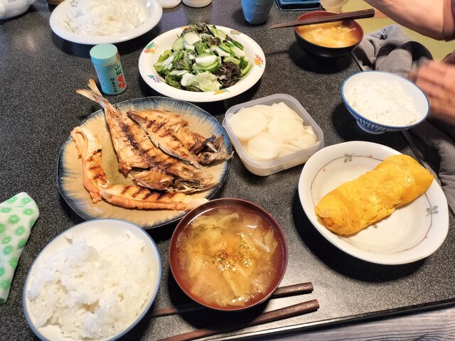 朝食はご飯を炊いて アジの開きと鮭のハラミを焼いて食べました