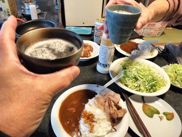 ランチは 昨晩 残った肉を焼き 焼肉 カレーを食べた