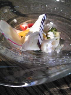まずやってきたサラダは、きれいなガラス皿に色とりどりの生野菜。