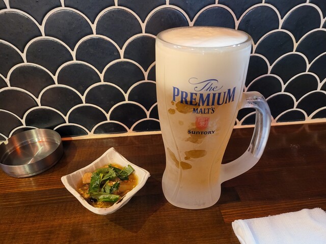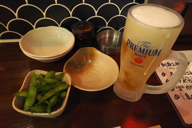 生ビールとお通しの枝豆。