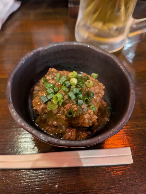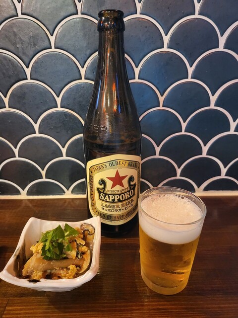 赤星でスタート。お通しは鶏肉とアサリの卵とじ。お通しからして凝っています。