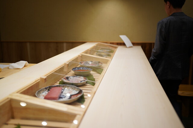 中に入るとすぐにネタケースが目に入り、当然、椅子はない。