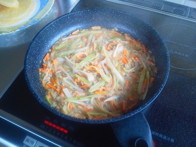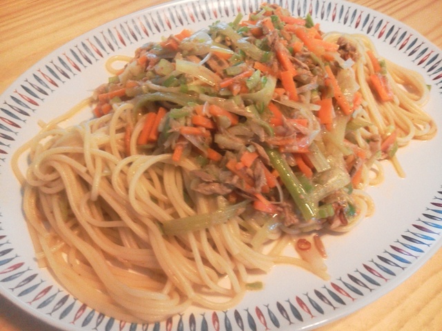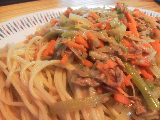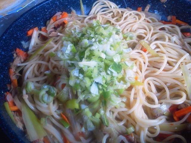 長ネギ、人参、シーチキン、鷹の爪煮込み中