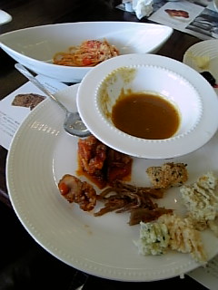 1皿目を食べ終え、2皿目を取りに行ってテーブルに戻ったときにはパスタがきていました。