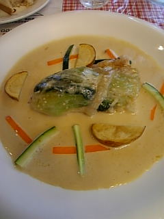 美しい盛り付け。白いソースの海に浮かんでいる鮮やかな緑色の島。海を渡る鳥のように盛り付けられている付けあわせの野菜。まるでキャンパスに描かれた一枚の絵のようでした。