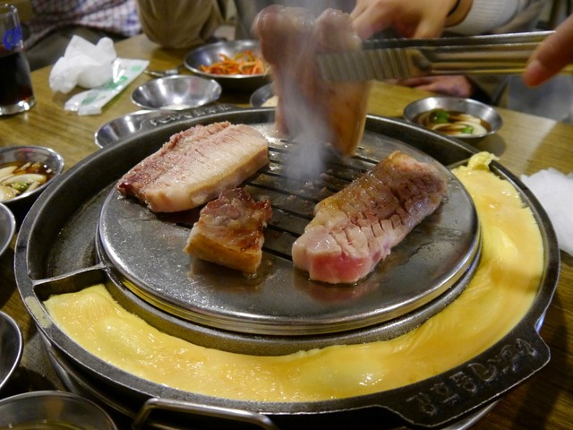 焼き台の周囲に溝があり、そこで、オーギョプサルを焼きながら、玉子チム、キムチ、にんにくなどを同時に作ることができる便利な形をしている。