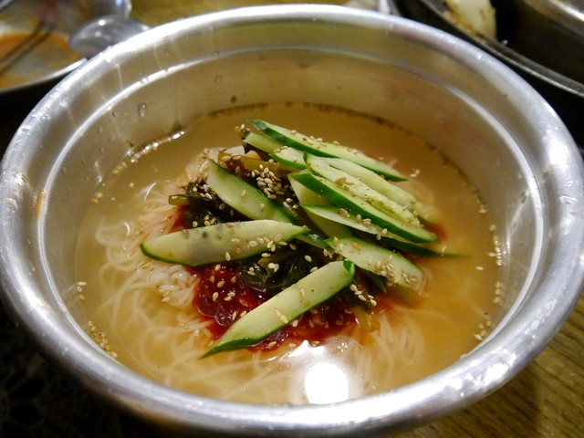 冷麺はちょっとヤンニョンなどを添えて、ぴりっと引き締まった味わいに。