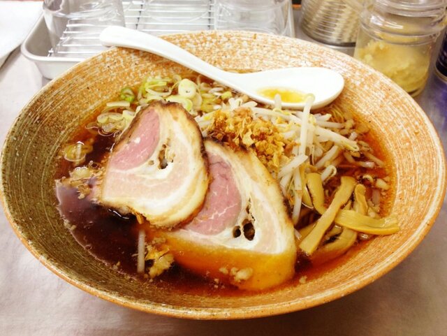 Wスープのパイオニア、中華そば青葉。動物系の出汁と魚介系の出汁を別々に炊いて器の中で融合(現在は別々に炊いたものを寸胴で融合するとのこと)させるという斬新なアイデアで、従来の常識では相入れないと思われ...