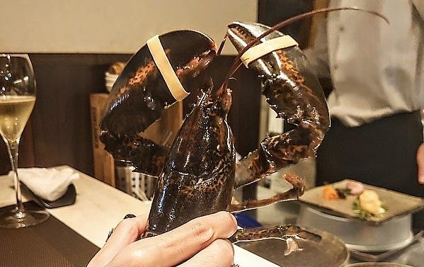 活オマール海老の鉄板焼き生きたままのオマール海老を持たせてくれました。まるまる一匹いただきます。