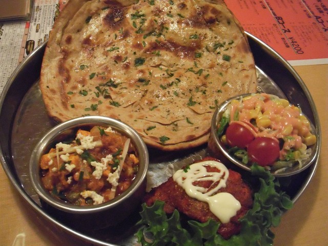 約15分ほどで配膳、パラタはバジルが載っていて、思ったよりサイズがでかいですね(^∀^)。