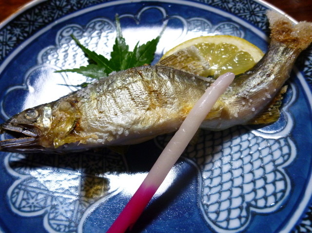 肥えた立派な鮎です。パリッと焼かれた皮目は勿論、程良い苦みがある