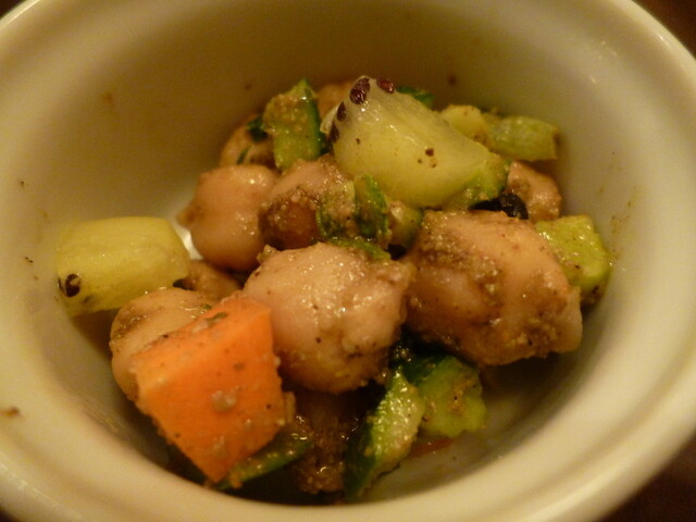 新鮮な魚介類の組み合わせが面白いです。野菜のマリネは、少し酸味が