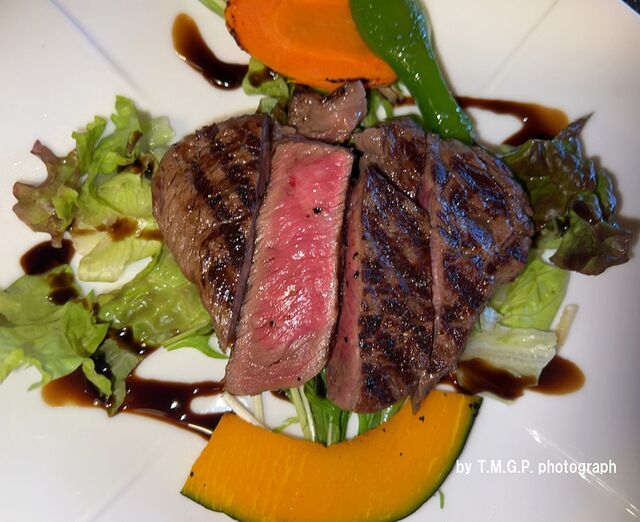特産松阪牛実食記。お肉料理 カフェ(Cafe)まつもと(三重県多気町)2013年7月5日オープン。松本牧場の直営6次産業レストラン。ステーキをいただきました。但馬牛の素牛を肥育することのこだわり。