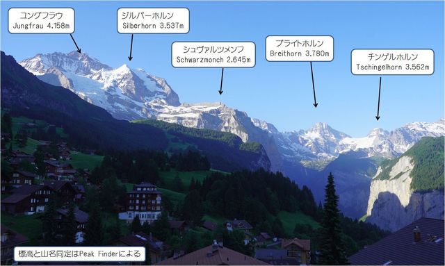 また、麓のラウターブルンネン谷や谷向かいのミューレンの集落方面も眺めることができ、眺望としては最高の部類ではないでしようか。(もちろん、後日宿泊する“あこがれ”レベルのホテルには敵いませんが)。