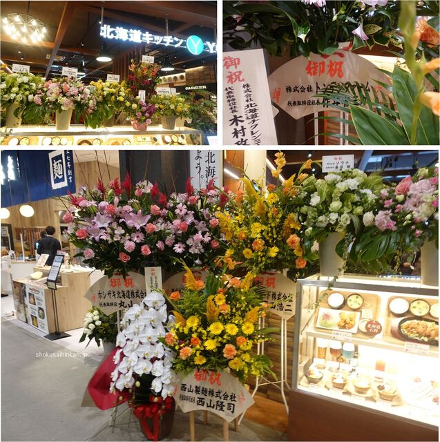 開店祝いの生花を見ると「西山製麺」や「トンデンファーム」などの名前が見えて北海道を感じる。