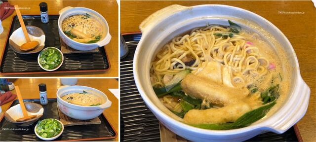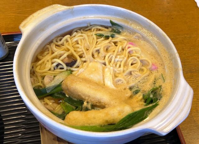 トッピングも油揚げ、地ネギ(葉の部分を利用する西三河葉ネギ)、干し椎茸、鶏肉と鍋焼きうどんのソレ。