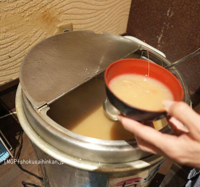 味噌汁はセルフで盛り放題飲み放題。具はエビの頭と端材少々。