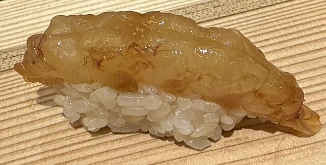 回転寿司店で提供されることの多いアルゼンチンレッドではなく国産ホッコクアカエビと思われる。甘味と旨味が凝縮。