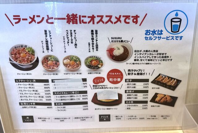 鶏そば,台湾担々(×坦),担々鶏そば,台湾まぜそば,中華そば,お子様ラーメン,ハラルラーメン等々。一品メニューもある。