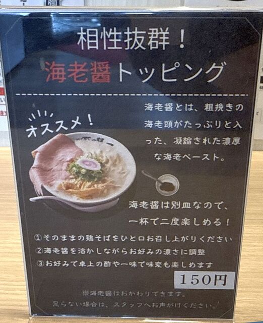 ~カエシタレ(鶏中華そばの醤油タレ)は厳選された三種の醬油をベースにブレンドし、味醂、酒などを独自の配合で「口当たりの良い甘辛さ」に仕上げてあります~(FC本部HPより)