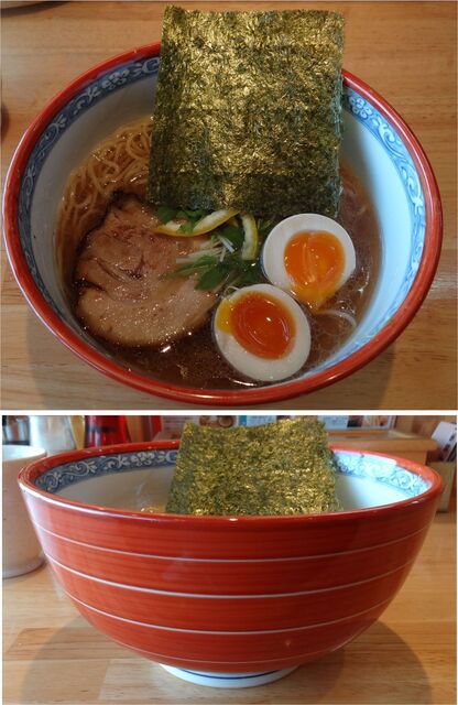 脂が浮いているがくどくはない。中細麺でちぢれタイプの麺(専門家ではないのでどう見ても「中太麺」とは思えない。太い=家系のような麺、中=つけ麺につかう位の麺、細=博多ラーメンに使う麺)と大雑把に区別しているだけなので()。