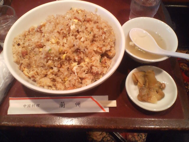 注文から8分後、チャーハン大盛り、スープ、ザーサイが運ばれてくる。ちなみに1階から店内エレベーターで運ばれてくるのだが、岡持ちに入れて運ばれるのが微笑ましい。