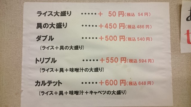 また、普通に注文してもボリュームは多めなのだが、追加料金で増量も可能で、具とライスが大になる「ダブル」は250円増し、具とライスに加え味噌汁も大になる「トリプル」は300円増し、具とライスと味噌汁に加えキャベツまでもが大になる「カルテット」は350円増し(いずれもカツの定食はさらに100円加算)。