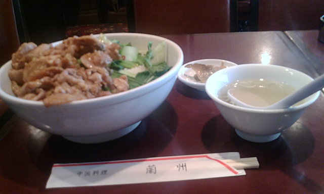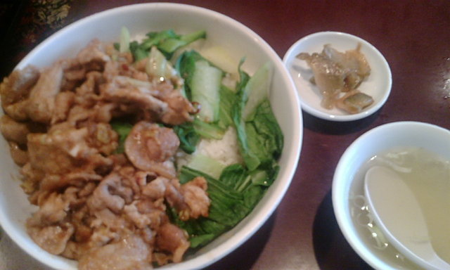 肉丼は、豚の肩ロース肉の味噌炒めと青梗菜がご飯の上にのったもの。相変わらずどどんと盛られている。ザーサイとスープもついている。